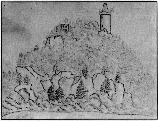 „Asi šest set kroků vzdál od vchodu...rozstoupí se oudolí po levé straně v širší, ale jenom krátký dol. Uprostřed něho stojí vysoká hustě porostlá skála, korunovaná zříceninami starého hradu...(Cikáni)