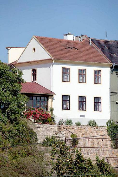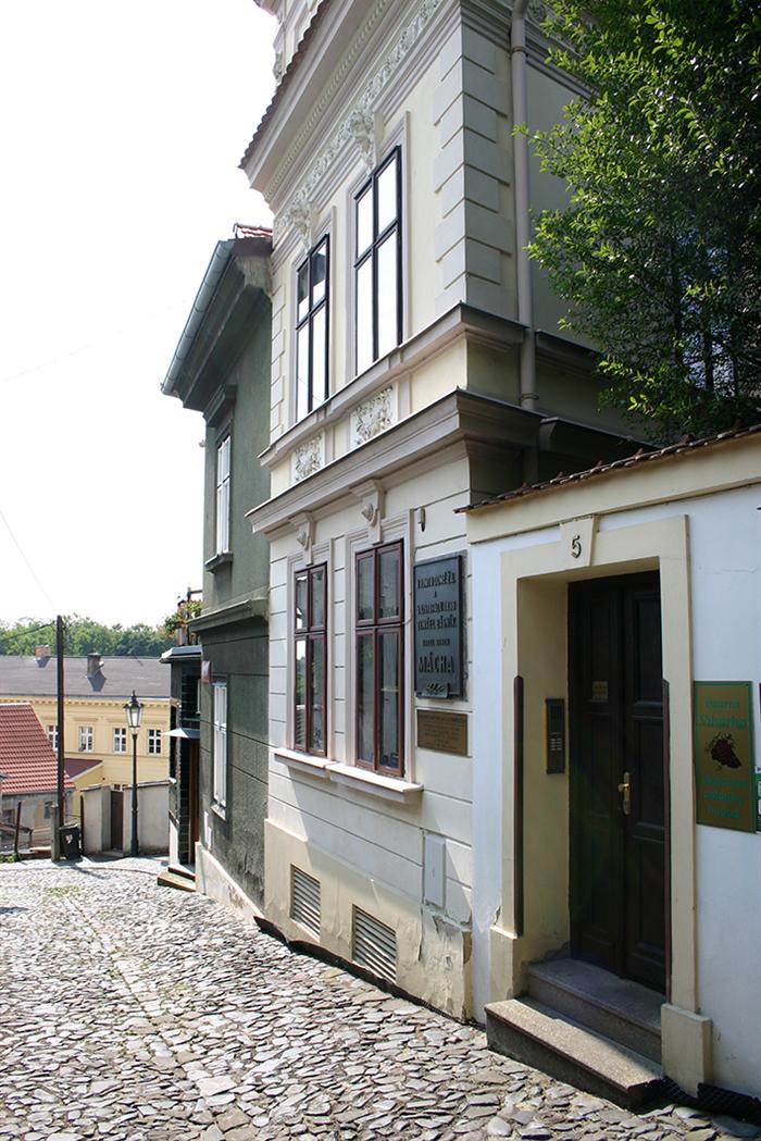 Dům Na Vikárce s pamětní deskou, kde je dnes Památník Karla Hynka Máchy, a tentýž dům z opačné strany s okny, kterými je vidět západní část Českého středohoří s výrazným panoramatem hradu Hazmburk.